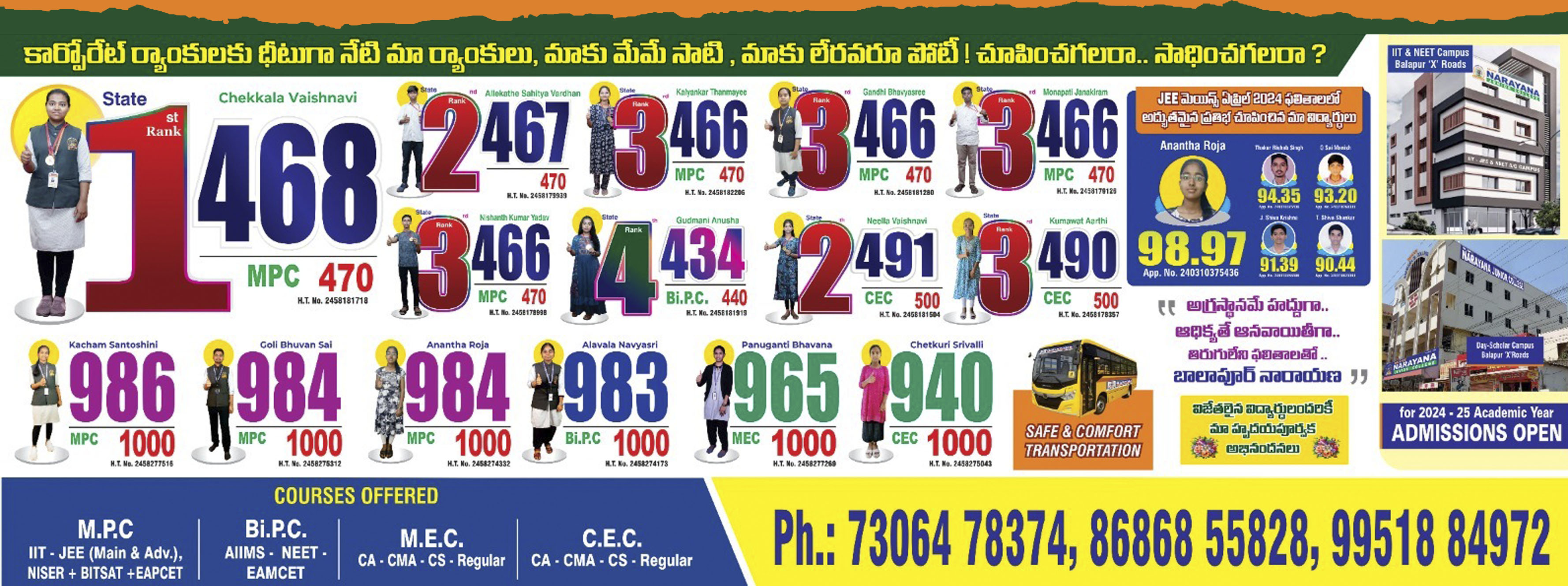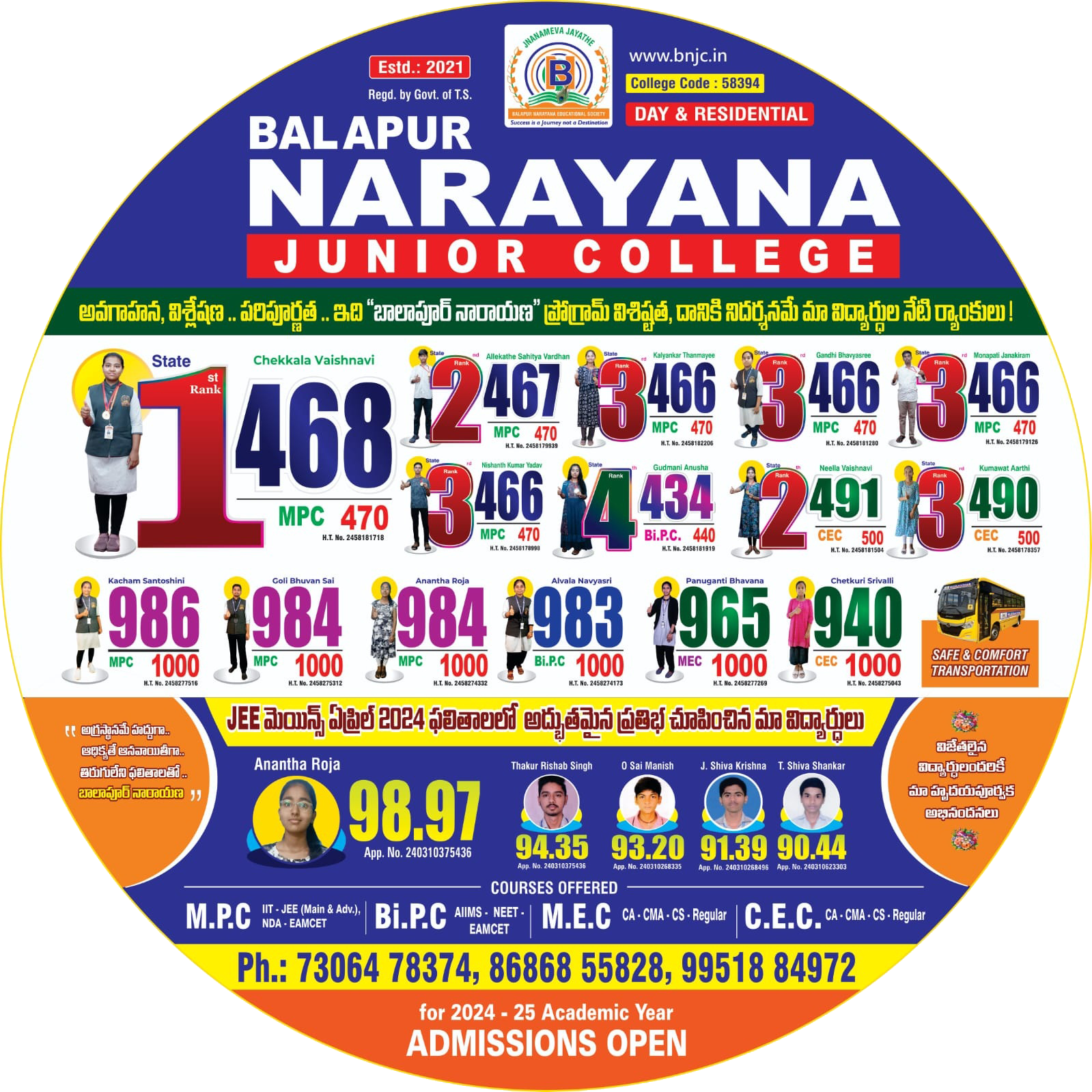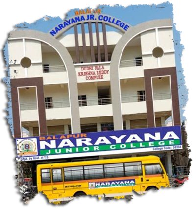 Balapur Narayana junior College is proud of its presence among today's student generation, especially aspiring Engineers, Doctors and Accounting Professionals With regard to constantly pioneering new trends in the areas of technology, innovation and research oriented material.